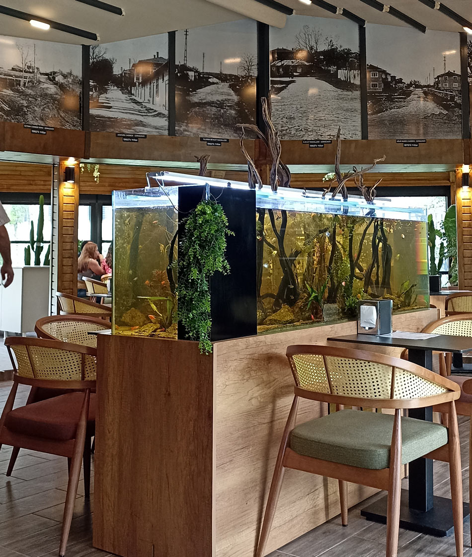 Mekanın içindeki akvaryumlar, eski Çerkezköy fotoğrafları ve botanik alanları